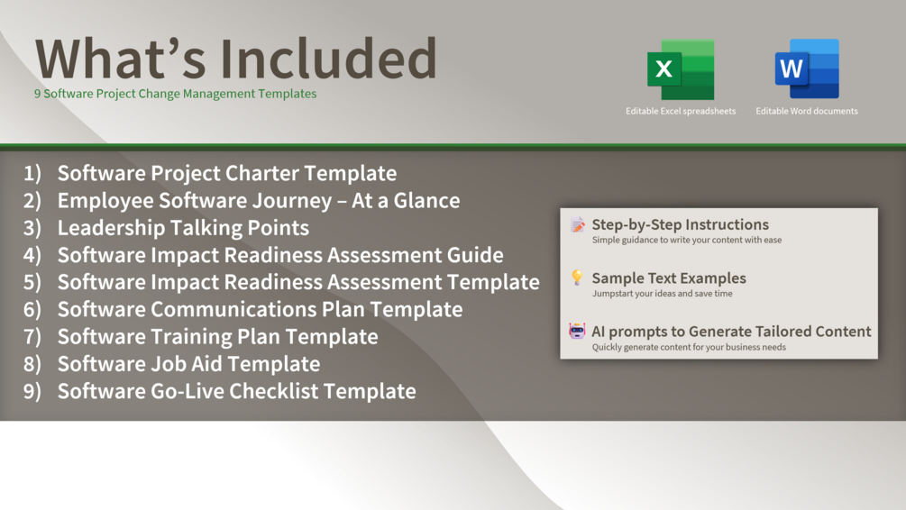 A complete set of editable templates covering every stage of a software rollout, including planning, readiness assessment, communication, training, and go-live preparation. Each template includes clear sections, sample text, and AI prompts to help you tailor content quickly while keeping the focus on people.