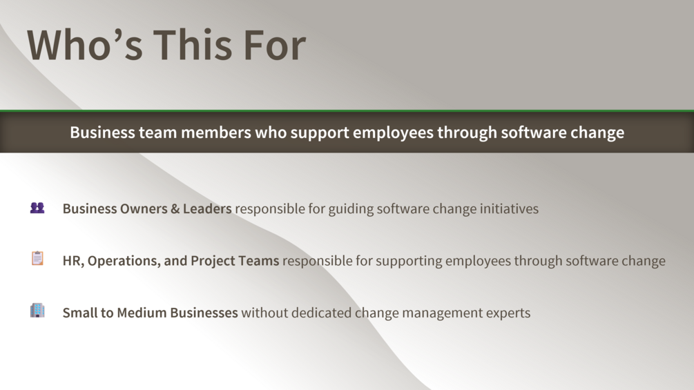 - Reinforces a consistent, people-first approach to software change